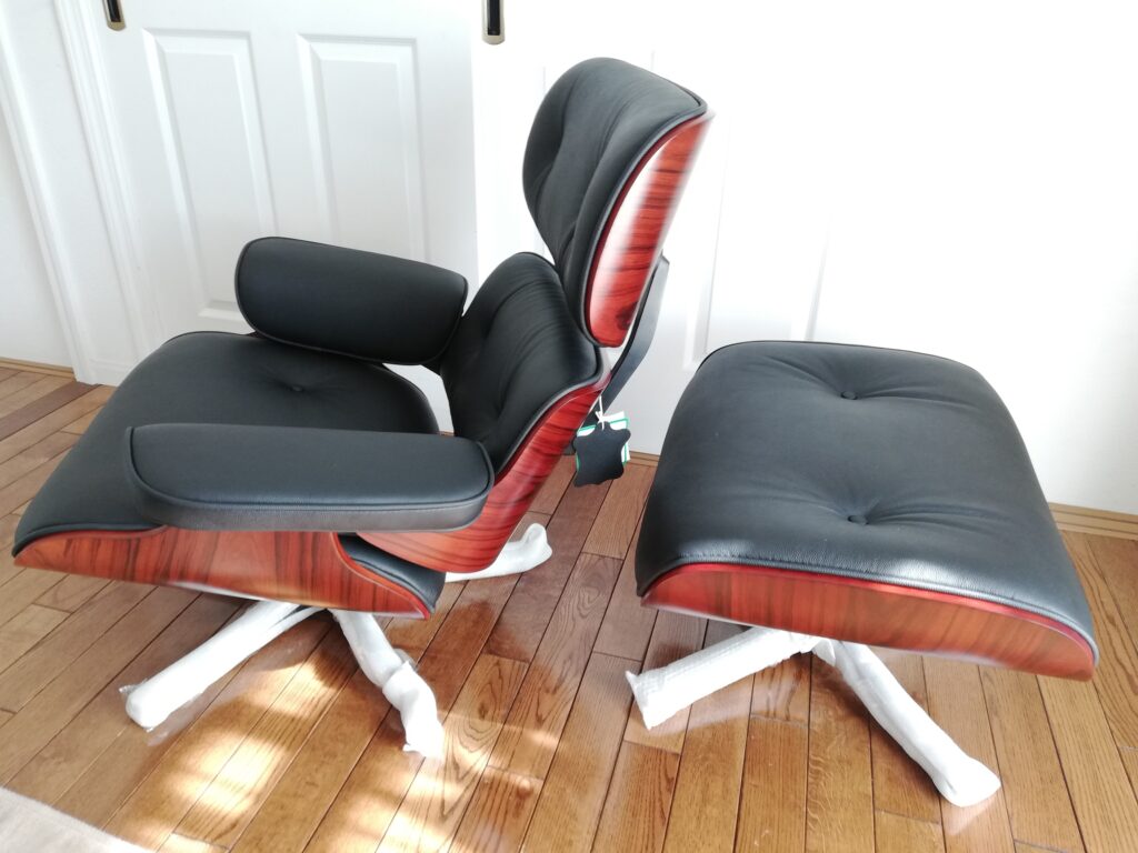 MULOCO製のイームズラウンジチェア、ブラックレザー、ローズウッドです。脚は見えませんが、黒塗装です。当ストアで組み立てを行い、ヤマトホームコンビニエンスさんに福島の個人のお客様まで配送してもらいました。