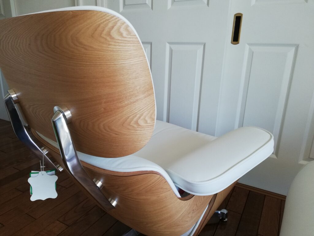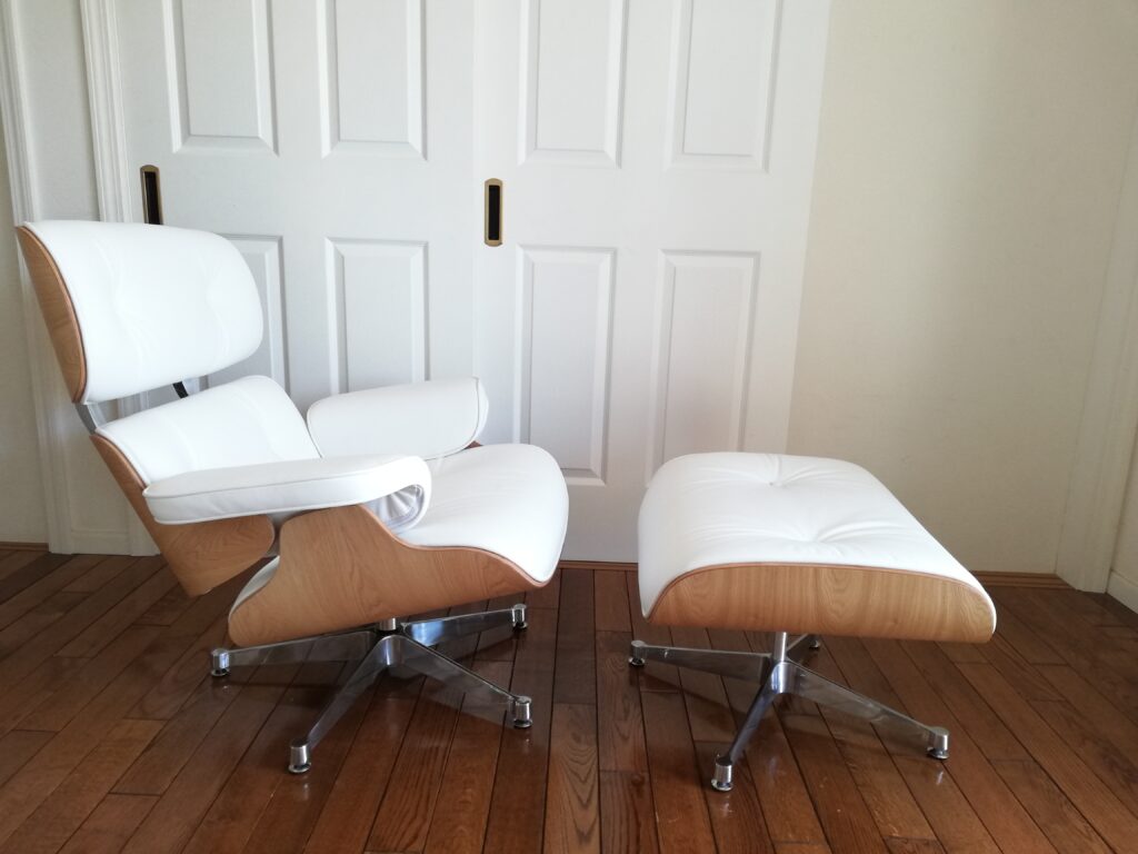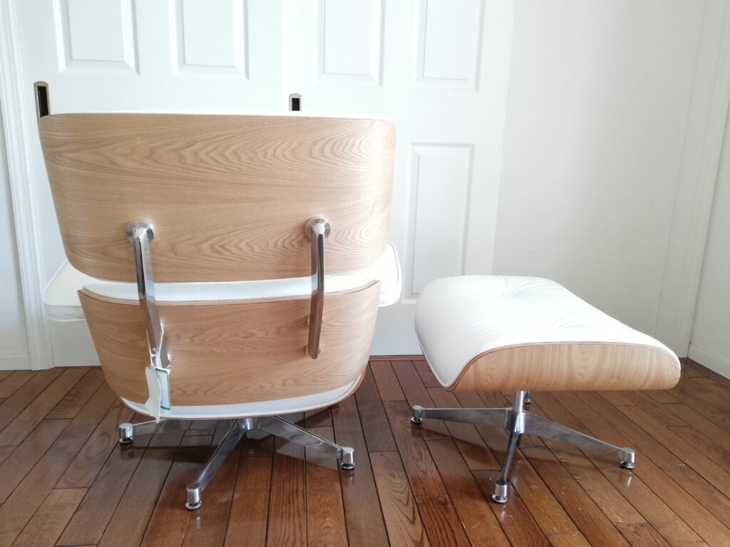 ラウンジチェア&オットマン、ホワイトアニリンレザー、オークウッド。